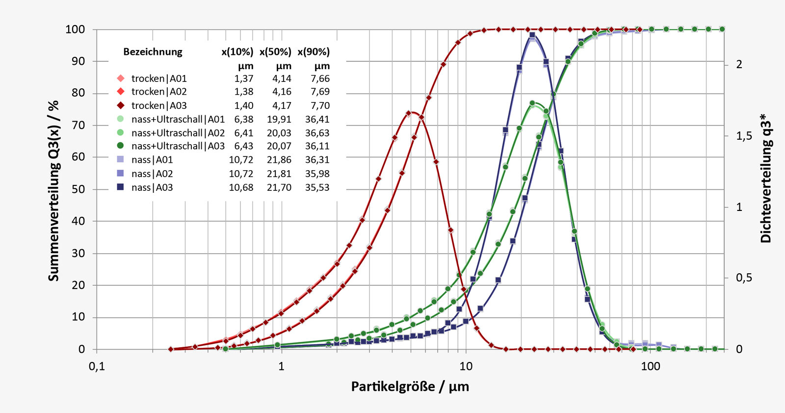 Bei NdFeB-Pulvern ist die Trockenmessung besonders vorteilhaft, da das Material in der Regel trocken gehandhabt wird und nasschemische Einflüsse somit vermieden werden können. Eine effektive Dispergierung ist unerlässlich, um Agglomerate aufzubrechen und zuverlässige Messergebnisse zu erzielen.