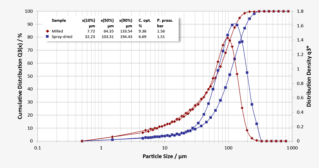 In the formulation of oral solid dosage forms or dry powders for inhalation, pharmaceutical grade lactose is used in many different particle size distributions and modifications. The compressibility, flow characteristics and granulability of the lactose powder depend directly on the size, shape and size distribution of the particles. These physical attributes are selectively adjusted by sieving, milling, spray-drying or agglomeration to guarantee the best functional characteristics for tableting, granulation or blending processes. Fast and reliable particle size analysis ensures that the quality of the various lactose products is consistently high.