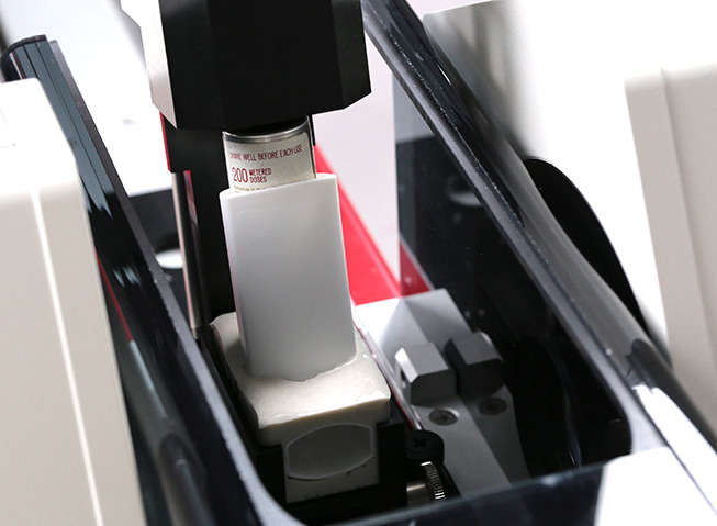 In order to simulate the way a nasal spray is tilted in the actual application by the user, this system can be upgraded with the traversing unit ROTOR. In addition, the modular concept of the HELOS laser diffraction series allows this configuration to be systematically expanded with numerous dispersion units and dosing options to open up many more measuring applications.